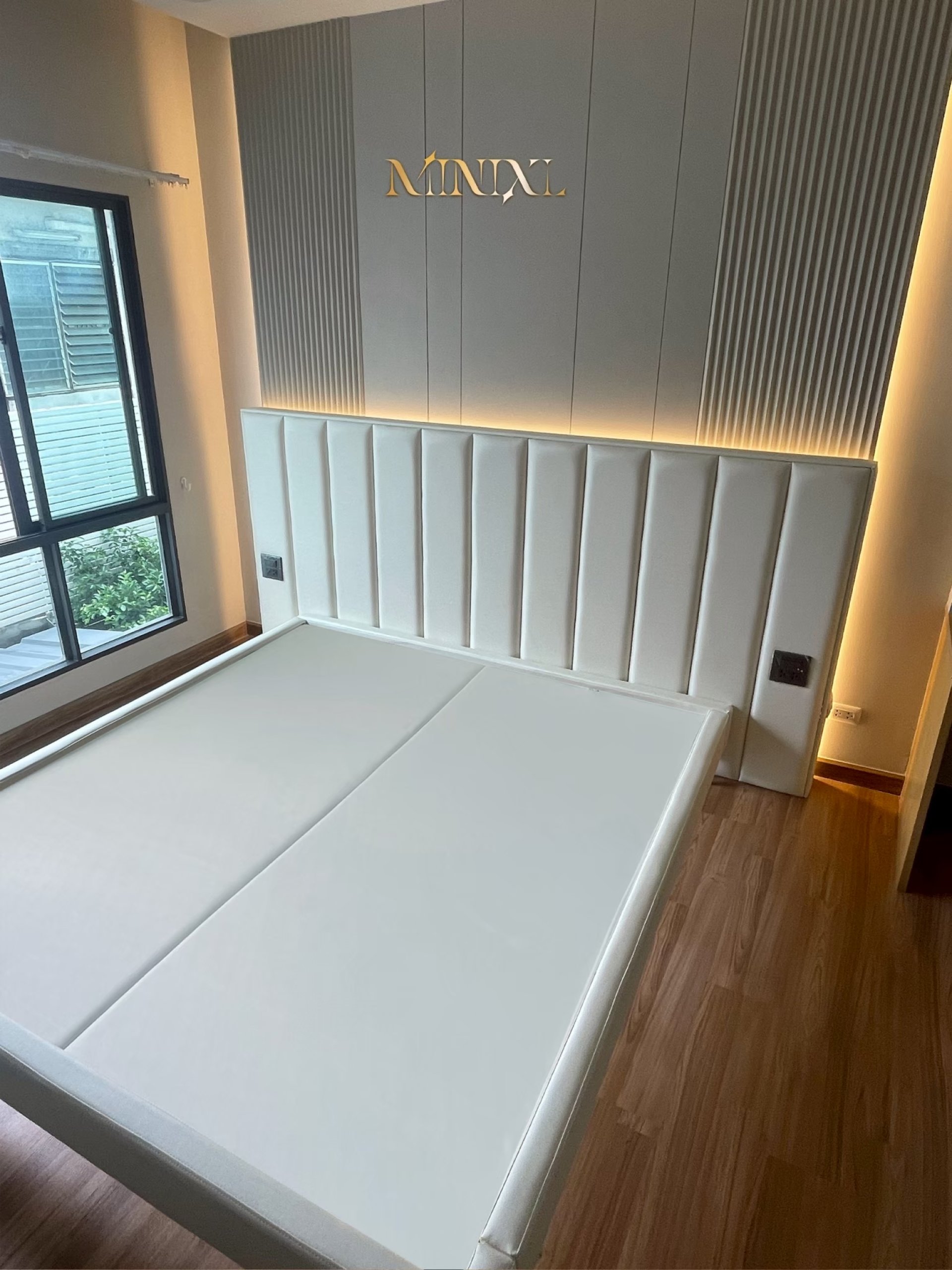 สำหรับงานในโพสนี้ อยู่ที่ Cherkoon Designed Townhome สวนผักซึ่ง MINIXL ได้รับโจทย์จากลูกค้า - คุณชุลีพรรณ ให้ออกแบบชุดเตียงพร้อมผนัง (BED & WALL) ให้สอดคล้องกับบิลท์อินเดิมในบ้านที่ตกแต่งไว้แล้ว และให้ฐานเตียงสวมโครงฟูกปรับระดับได้ (แต่วันที่เราเข้าไปถ่ายรูป โครงฟูกปรับระดับยังไม่มาติดตั้ง) นอกจากนี้ยังปรับดีไซน์ฐานเตียงให้เป็นแบบยกขาลอยจากพื้นด้วย เตียงรุ่น RAIN 03 ขนาด 6 ฟุต หัวเตียงกว้าง 254 cm (Custom Size) ผนังตกแต่ง ไม้ลอนทำสีพ่นและไม้ลามิเนตสีเรียบ W2.54 x H2.60 m