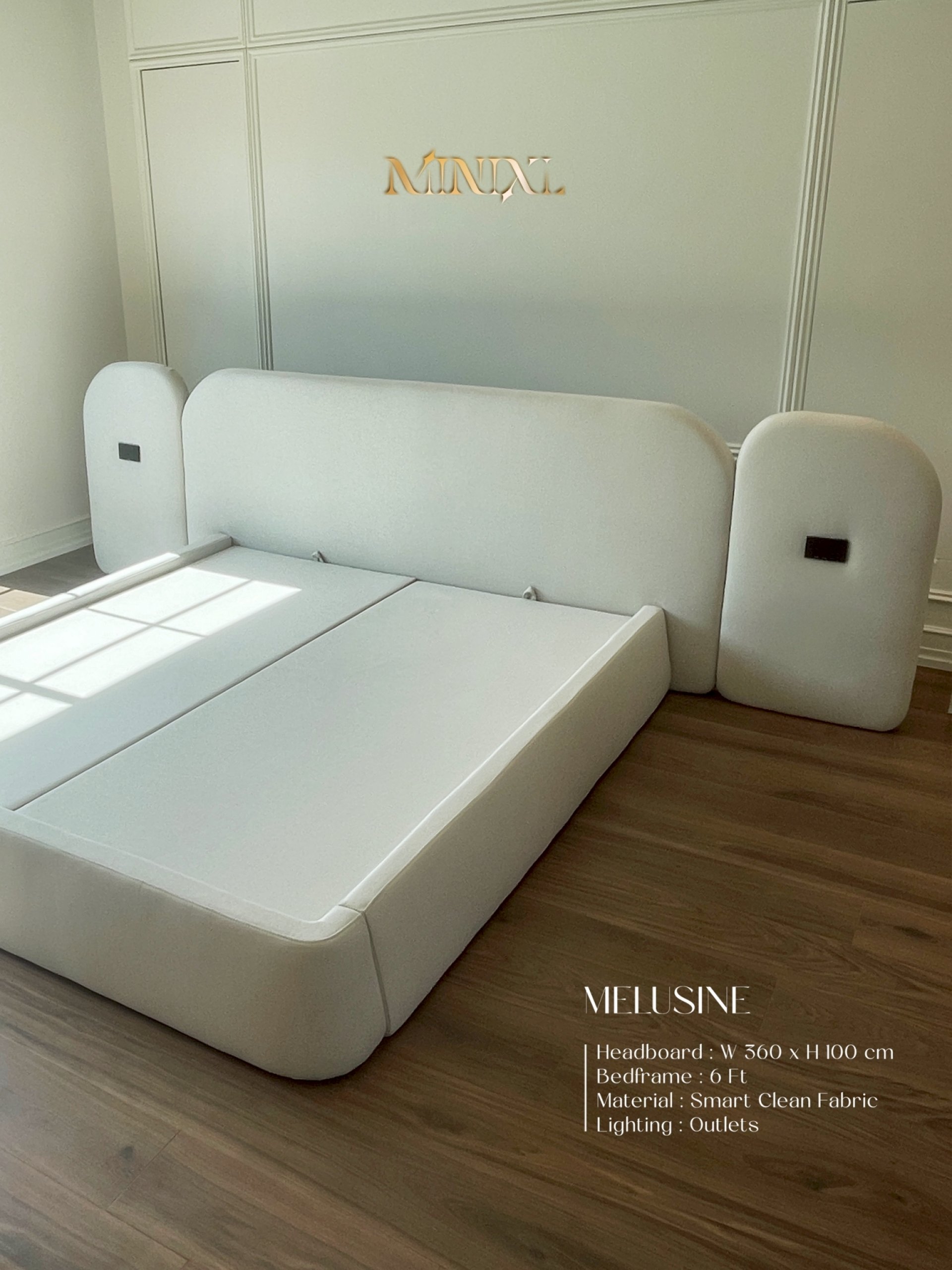 เตียง รุ่น MELUSINE เตียงพร้อมหัวเตียงปีกกว้าง (Elongated Headboard) ที่ออกแบบด้วยเส้นโค้งมนเหมือนใบหูที่ต่อขยายไปด้านข้าง ให้ดูเป็นฉากหลังที่สมส่วนกับห้องกว้างๆ เน้นโครงสร้างที่มั่นคงและการตัดเย็บสุดเนี๊ยบ ให้ดูนุ่มละมุน น่าสัมผัส